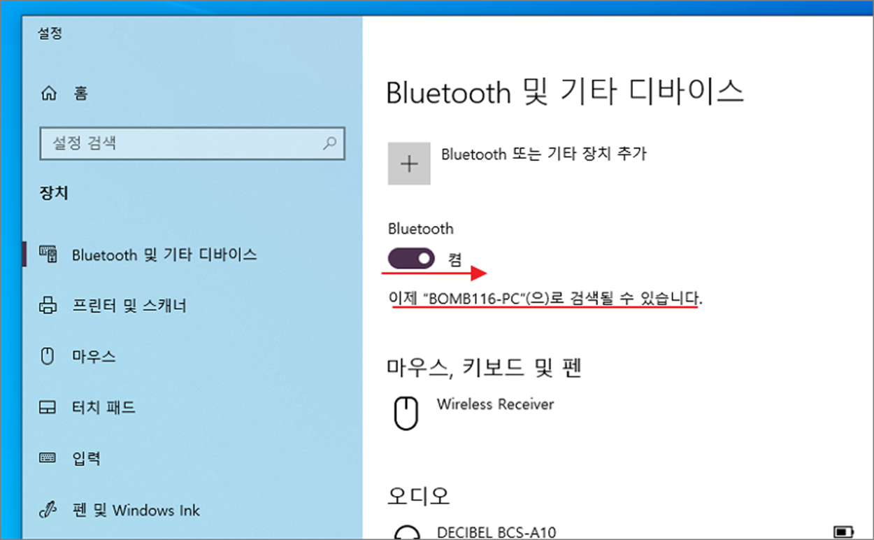 ▼ 만약 위와 같이 블루투스 아이콘이 보이지 않는다면 윈도우 설정 > 장치 > Bluetooth 및 기타 디바이스 를 선택해서 이동합니다. Bluetooth 장치 관리 설정 페이지를 열었다면 Bluetooth 옵션을 켬 으로 변경합니다. 이제 주위에 있는 블루투스 기기가 PC 를 검색할 수 있게 되었습니다.