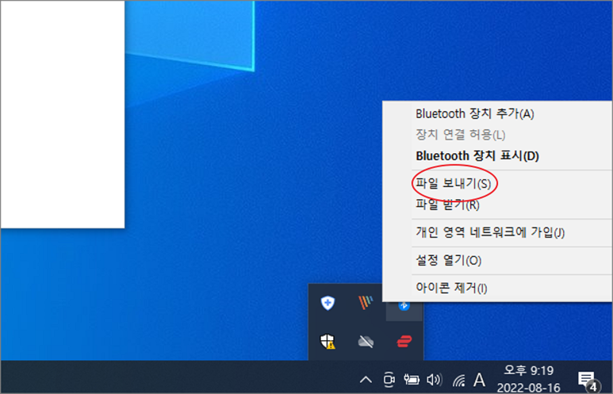 ▼ 이제 연결된 스마트폰으로 파일을 전송해 볼까요? 트레이 아이콘으로 가서 블루투스를 선택한 후 오른 마우스를 눌러 파일 보내기 메뉴를 클릭합니다.