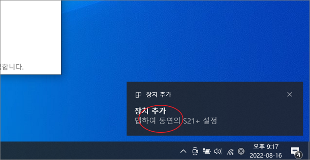 ▼ 스마트폰에서 등록 요청하고 바로 노트북으로 가면 장치 추가 메시지가 뜹니다. 바탕화면 오른쪽 하단에 뜬 메시지 창을 클릭합니다.