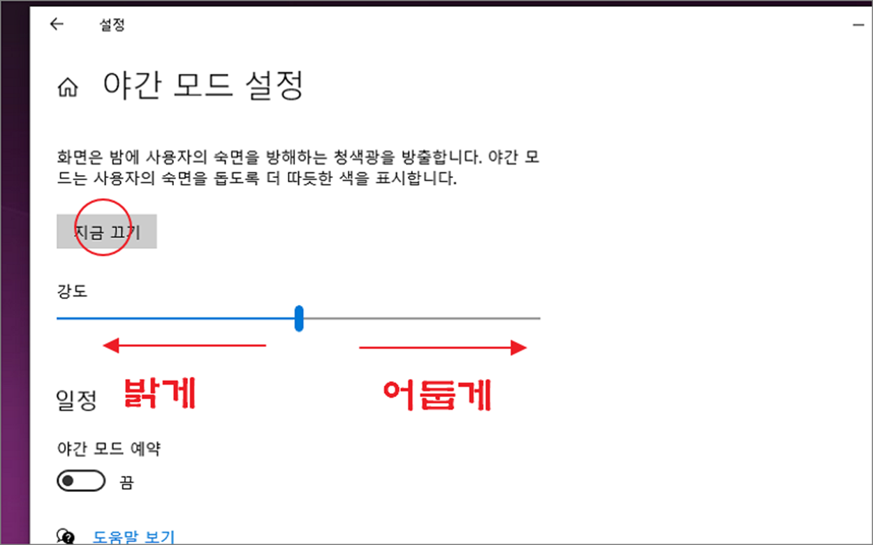 ▼ 야간 모드 설정 상세페이지에서 지금 켜기/ 지금 끄기 버튼으로 시작하거나 중지합니다. 야간 모드를 시작하고 바로 아래 강도 스핀 컨트롤을 마우스로 조절하면서 밝기를 결정합니다. 기본값은 중앙인 50을 기준으로 왼쪽으로 갈수록 밝아지며, 오른쪽으로 갈수록 어둡게 변합니다.