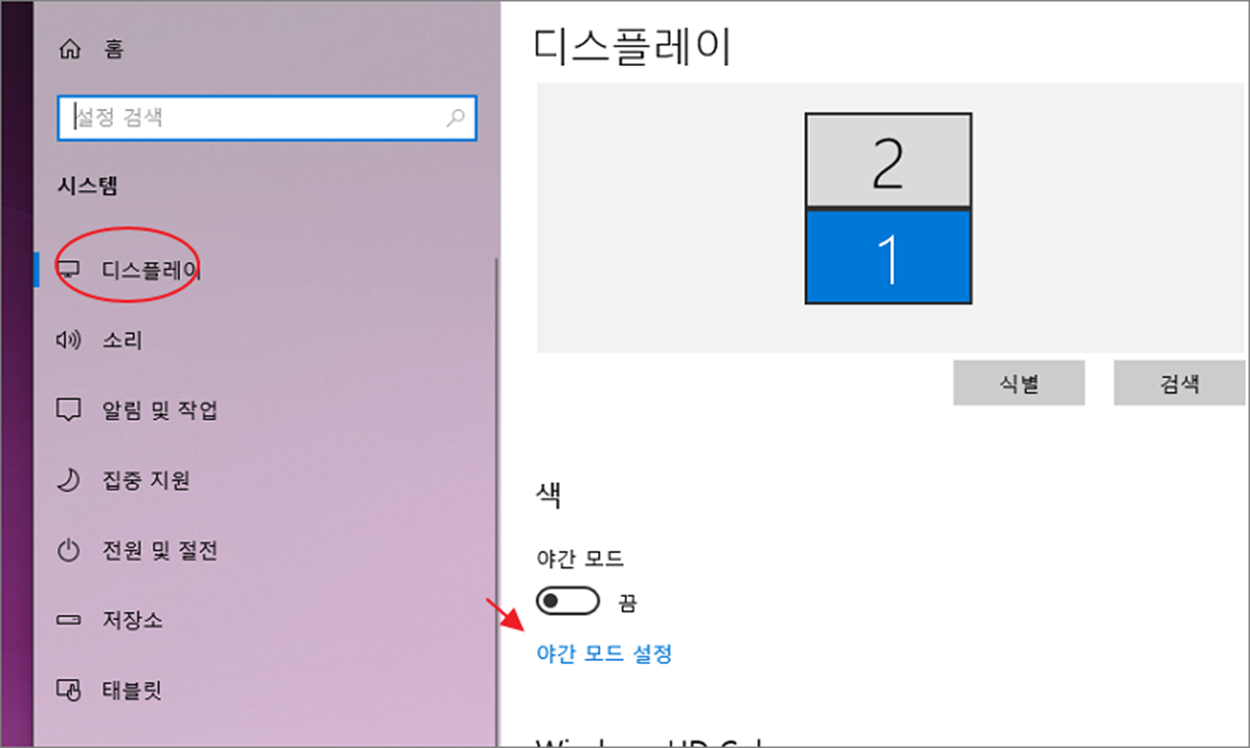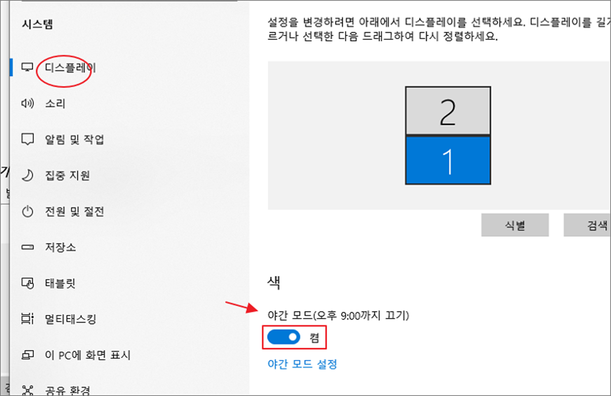 ▼ [시스템] 페이지에서 왼쪽 메뉴 목록 중 [디스플레이]를 선택합니다. 오른쪽 색 항목으로 가서 야간 모드 를 켬으로 변경합니다. 야간 모드는 기본 설정된 시간대에 맞춰서 자동 적용됩니다.