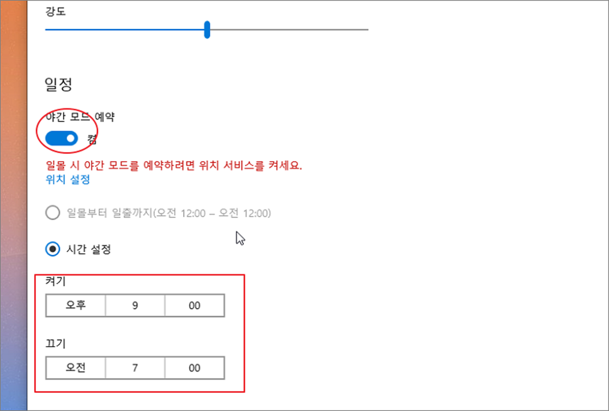 ▼ 야간 모드는 시간대를 정해서 켜거나 끌 수 있습니다. 바로 아래 일정 항목에 야간 모드 예약 옵션을 활성화합니다. 그리고 시간 설정을 변경해서 자신에게 맞는 모드를 만들어 보시기 바랍니다.