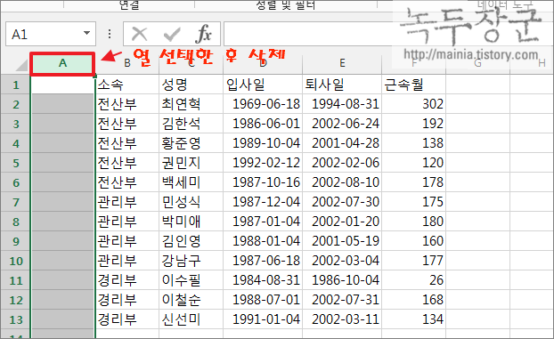 ▼ 텍스트 나누기 마법사에서 3단계를 거쳐 설정이 끝나고 마침 버튼을 눌러 창을 닫게 되면 아래 그림처럼 첫 번째 열은 공백과 텍스트로 구분되게 됩니다. 분리된 공백 열은 삭제하면 되겠죠. 많은 데이터를 한번에 구분할 수 있어서 텍스트 나누기 기능은 아주 유용합니다.