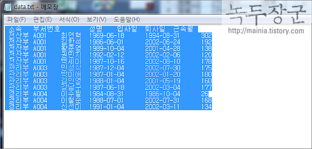 ▼ 먼저 엑셀에 옮길 데이터를 메모장으로 엽니다. 아래 그림처럼 각 열을 분리할 구분자는 있어야 합니다. 공백이나 콤마 등의 분리 기준이 있다면 엑셀에 붙여넣기만 해도 자동으로 분리가 됩니다.