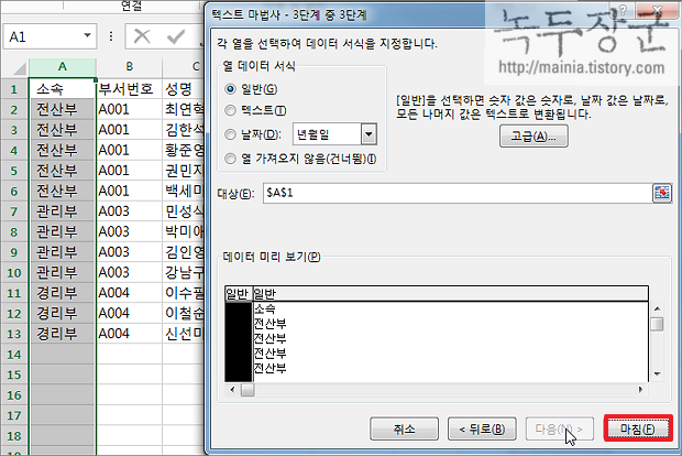 ▼ 세 번째 단계는 분리될 각 셀의 데이터 형식을 지정하게 됩니다. 공백은 수정할 필요가 없겠지만 분리될 두 번째 텍스트 데이터는 구분된 후에 원하는 서식으로 변경이 가능합니다.