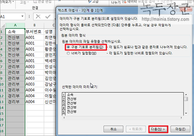 ▼ 두 번째 단계에서는 [구분 기호] 중 공백을 선택합니다. 그럼 바로 아래 [미리보기]에서처럼 분리되는 것을 알 수 있습니다. 마지막 단계를 위해 [다음]을 누릅니다.
