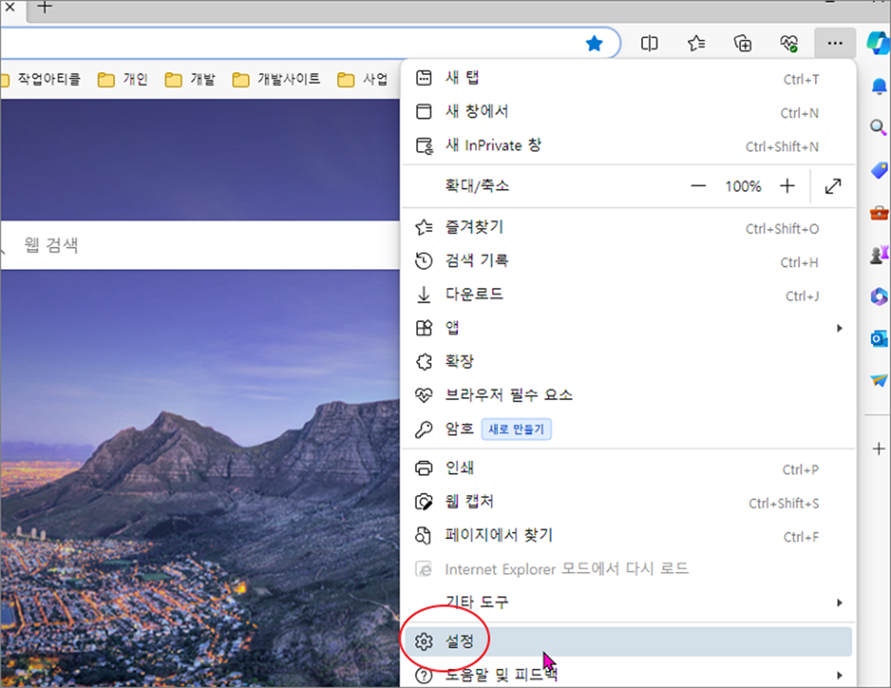 ▼ 먼저 엣지를 실행하고 오른쪽 상단에 있는 더보기 아이콘을 클릭합니다. 메뉴 목록에서 제일 하단에 있는 [설정]을 선택합니다.