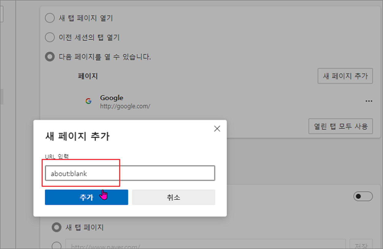 ▼ 새 페이지 추가 입력창이 뜨면 “about:blank” 라고 입력합니다. 그리고 아래에 추가 버튼을 눌러 창을 닫습니다.