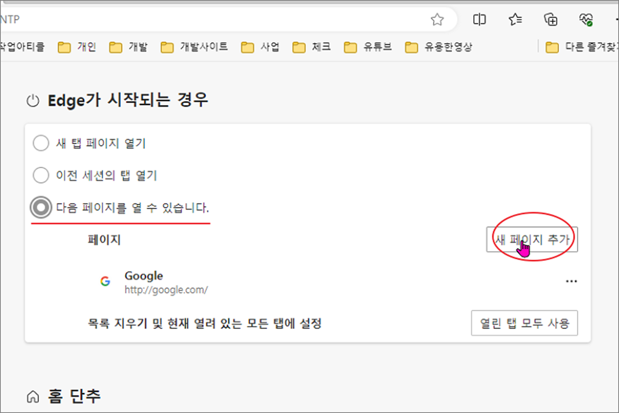 ▼ 3가지의 옵션 중 빈 화면을 설정하기 위해서는 제일 아래에 있는 “다음 페이지를 열 수 있습니다.” 를 선택해야 합니다. 그리고 오른쪽으로 가서 “새 페이지 추가” 버튼을 클릭합니다.