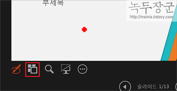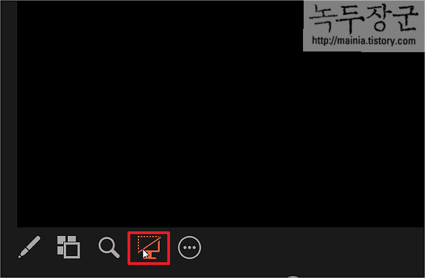 ▼ 네 번째 아이콘은 프레젠테이션의 현재 슬라이드를 숨기거나 숨김 해제 기능을 합니다. 슬라이드 쇼를 검정으로 설정/취소 할 수 있습니다. 이건 언제 쓰는지 모르겠군요.