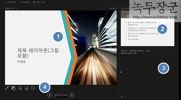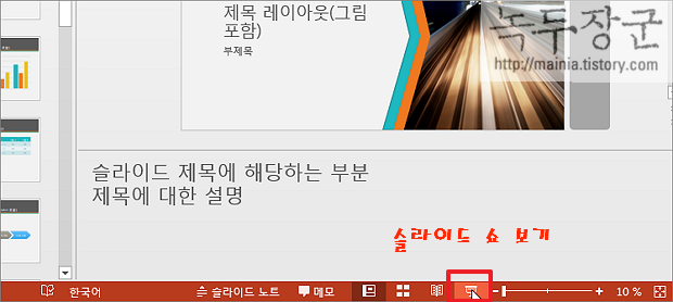 ▼ 프레젠테이션을 시작하기 위해서 슬라이드 창 아래쪽에 있는 [슬라이드 쇼] 아이콘을 클릭합니다.
