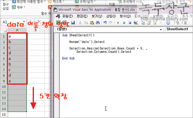 ▼ 데이터를 가공하는 과정에서 영역에 들어가 있던 값들이 수정될 수 있습니다. 아래 샘플처럼 기존에 9칸이던 영역을 5칸 더 늘이고 싶다면 어떻게 해야 할까요? 먼저 Select 함수를 이용해서 영역을 선택합니다. 그리고 선택된 영역에서 Resize() 함수를 이용하면 됩니다. 두 개의 인수는 차례 대로 행의 숫자와 열의 숫자를 입력합니다.