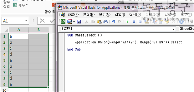 ▼ 이번에는 전체 영역이 아닌 각 행을 구분해서 선택하는 방법입니다. 연속된 영역이 아닌 구분된 영역은 Union 함수를 이용하시면 됩니다. 개별 영역을 Range 객체에 담은 후 Union 의 인수로 넘기고 Select 를 실행합니다.