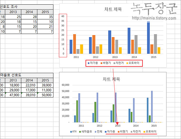 ▼ 두 개의 차트를 합치는 간단한 방법은 복사해서 붙여넣기를 하는 것입니다. 두 개의 차트 항목(가로축 레이블) 인 "년도" 동일하게 때문에 그래프가 하나로 합쳐지고 범례만 추가가 됩니다. 그런데 위에 있는 차트의 범위값이 아래 차트와 너무 차이가 나서 막대 그래프가 거의 보이지 않네요. 비슷한 값이라면 비교해 볼 수 있을 겁니다