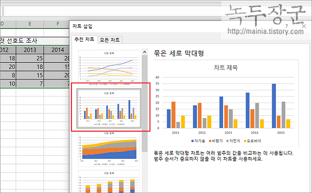 ▼ 차트 삽입 창이 뜨면 왼쪽 사이드에서 원하는 차트 모양을 선택합니다. 만약 마음에 드는 차트가 없다면 모든 차트 탭으로 이동합니다.
