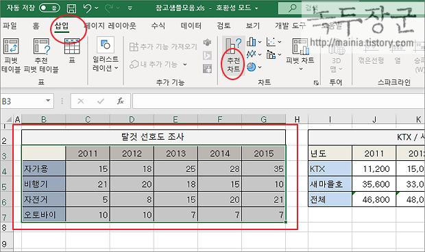 ▼ 먼저 두 개의 표에 차트를 추가합니다. 차트에 추가할 데이터 영역을 드래그해서 선택한 후 상단 삽입 탭 > 추천 차트 리본 메뉴를 클릭합니다.
