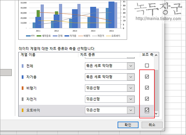 ▼ "데이터 계열에 대한 차트 종류와 축을 선택합니다." 에서 목록의 계열 중 값이 적어 보이지 않는 4개의 보조 축 옵션을 체크합니다.