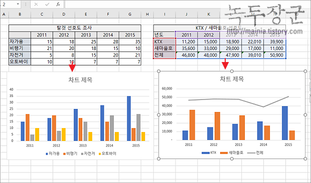 ▼ 각 표에 차트 추가를 완료했습니다. 다음은 두 개의 차트를 합쳐보겠습니다.