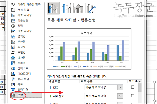 ▼ 차트 종류 변경 팝업창에서 모든 차트 탭으로 이동합니다. 왼쪽 메뉴에서 제일 아래에 있는 혼합 메뉴를 선택합니다. 오른쪽 화면의 데이터 계열 목록으로 이동합니다.