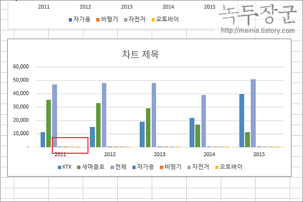 ▼ 그림처럼 아주 깨알 같은 크기라 계열을 선택할 수도 없습니다. 작은 값이라도 막대 그래프를 표현하는 방법은 있습니다. 오른쪽에 축을 하나 더 추가하는 것입니다.