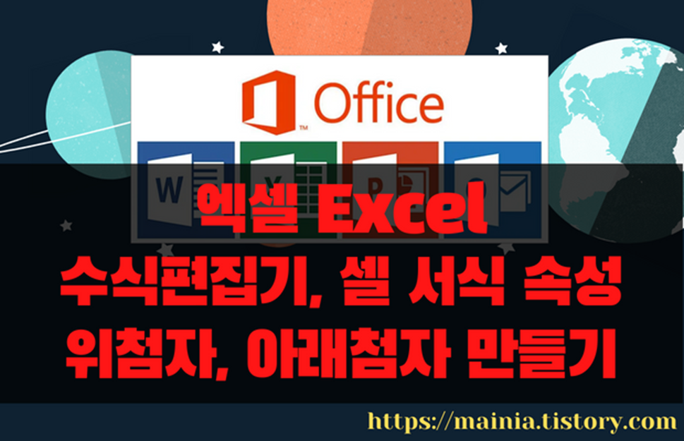 엑셀에는 워드와 달리 위첨자, 아래첨자 를 추가할 수 있는 리본 메뉴가 없습니다. 하지만 엑셀에서 수학 공식이나 화학기호를 사용한 표현들이 필요할 때가 있습니다. 이 때 리본 메뉴가 아닌 두 가지 방법으로 위첨자와 아래첨자를 만들어 넣을 수 있습니다. 수식 입력창과 셀 서식을 이용하는 것입니다.