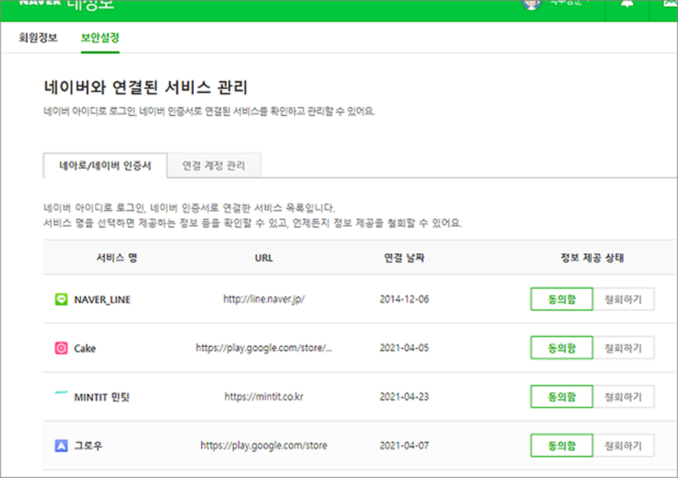▼ 여러 내용 중에 네이버 아이디와 로그인을 통해 연동된 사이트가 있는지도 확인합니다. 요즘은 네이버 계정으로 사이트를 가입하는 경우가 많기 때문에 어떤 사이트와 연계가 되어 있는지 확인하고 조치를 취합니다.