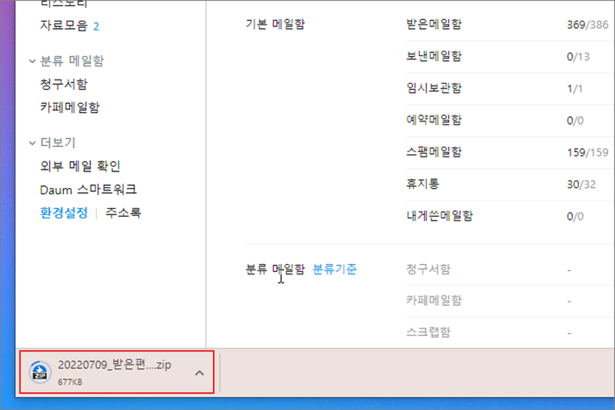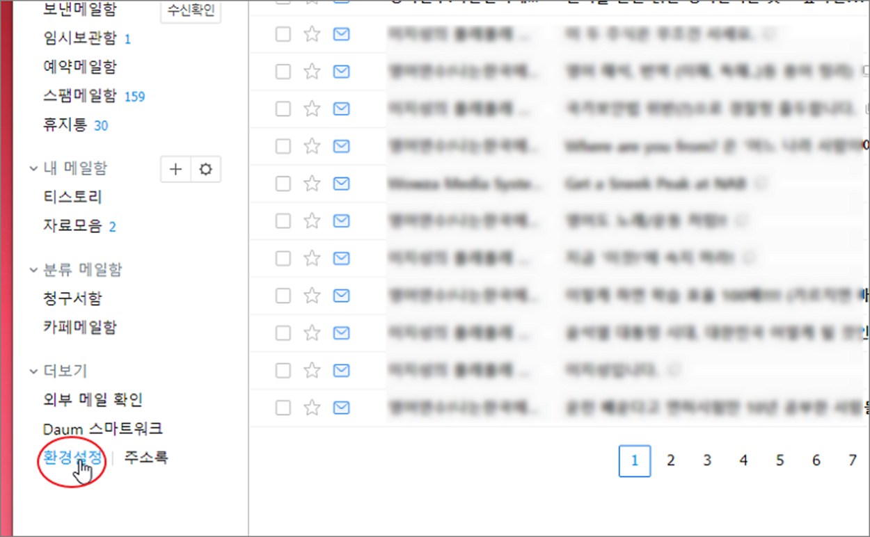 ▼ 먼저 메일 전체를 한 번에 백업 받는 방법을 알아보겠습니다. 저는 주로 메일 용량이 부족할 때 불필요한 메일들을 삭제하고 나머지를 백업합니다. 다음 메일로 접속한 후 왼쪽 사이드 메뉴 제일 하단에 환경 설정 메뉴를 클릭합니다.