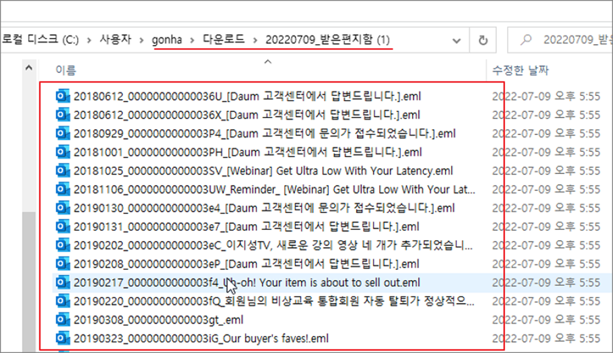 ▼ 백업한 메일함 전체 내용을 압축파일로 묶어서 다운받습니다. 백업 받은 파일의 확장자는 EML 입니다.