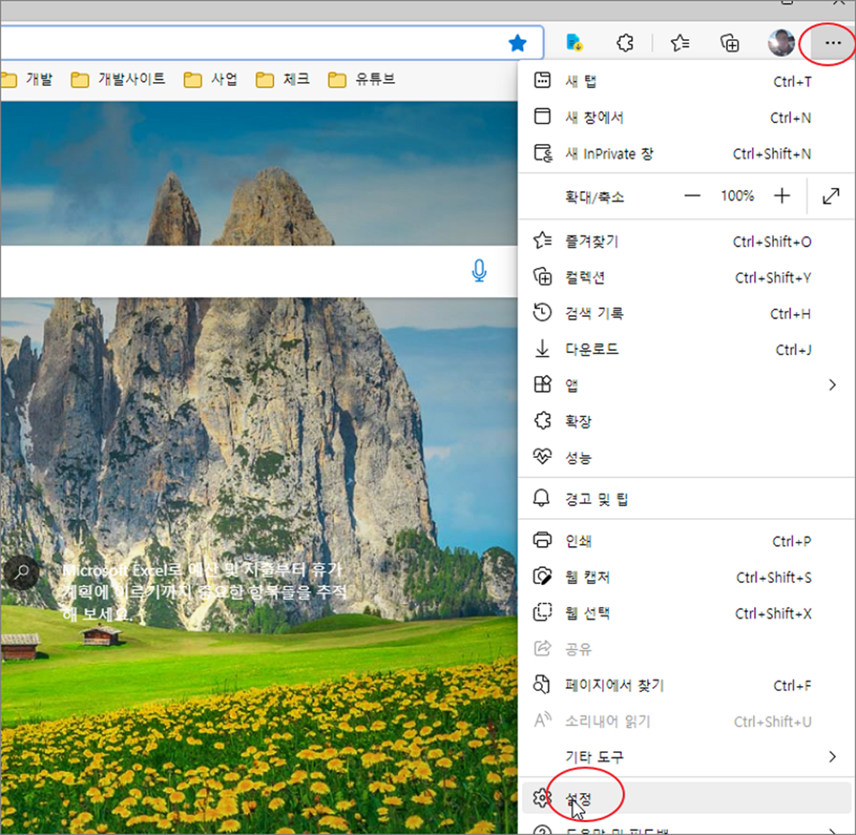 ▼ 두 번째 방법으로 엣지 브라우저의 설정에서 검색 기록을 모두 지웁니다. 엣지를 실행하고 오른쪽 상단에 [더보기] 아이콘을 누르면 [설정] 메뉴가 나옵니다.
