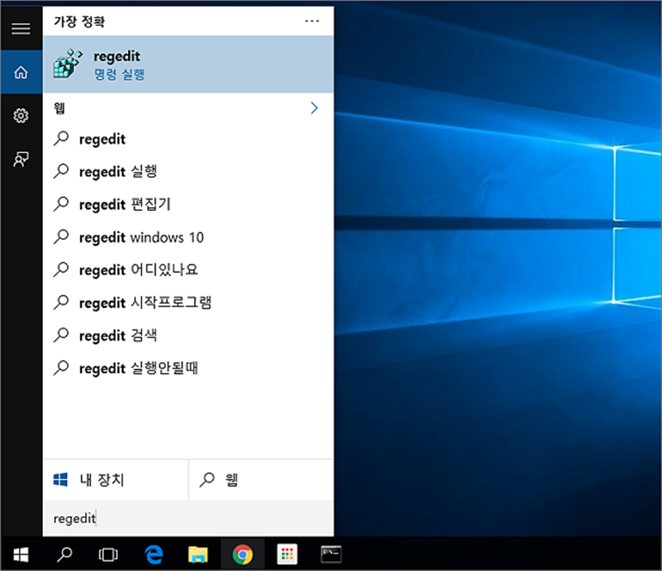 ▼ 마지막으로 레지스트리 값을 수정하는 방법입니다. 작업 표시줄에 있는 검색 아이콘을 눌러 레지스트리 편집기를 띄웁니다.