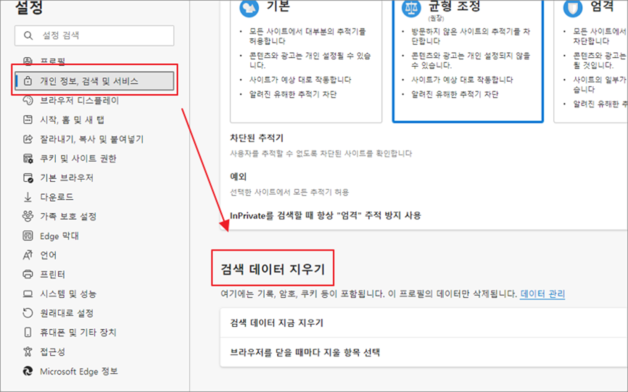 ▼ [설정] 페이지로 들어가서 아래로 내려가시면 [검색 데이터 지우기] 란에 [지울 항목 선택]이라는 버튼이 있습니다.