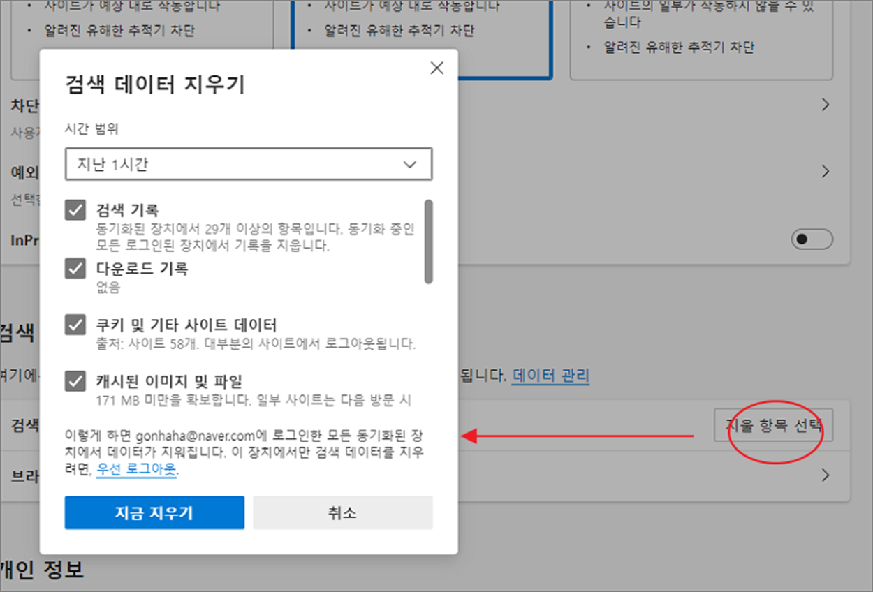 ▼ [지울 항목 선택]에는 다양한 체크 항목들이 나타나는데 모두 선택합니다. 그리고 아래에 [지우기] 버튼을 눌러 줍니다.