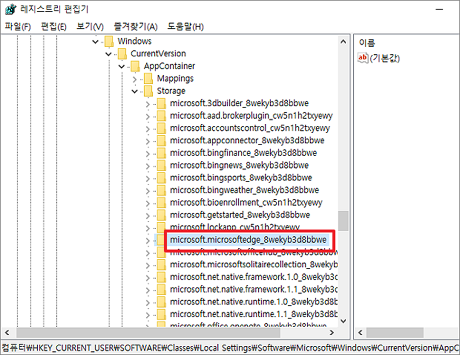 컴퓨터 > HKEY_CURRENT_USER > SOFTWARE > Classes > Local settings > Software > Microsoft > Windows > CurrentVersion > AppContainer > Mappings > Storage > microsoft.microsoftedge_8wekyb3d8bbwe