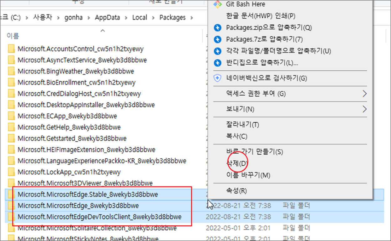 ▼ AppData > Local > Packages 로 이동해서 Edge 관련 폴더를 찾아 모두 삭제합니다. 그리고 재부팅한 후 엣지를 다시 실행해서 동작하는지 확인합니다.