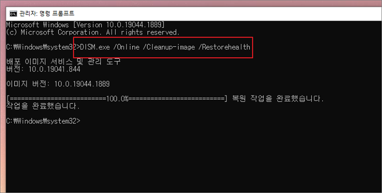 윈도우 시스템 파일에 문제가 생긴 경우 sfc 명령어로 복구하고 정상화가 가능합니다. 하지만 윈도우 원본 파일의 손상이 있는 경우 복구가 불가능하므로 DISM 유틸을 이용해서 온라인으로 파일을 다운받아 복구합니다. DISM(배포 이미지 서비스 및 관리) 도구는 Windows 이미지를 수정하는 데 사용되는 명령줄 도구입니다. DISM의 기능 명령을 사용하여 명령 프롬프트에서 직접 또는 이미지에 응답 파일을 적용하여 Windows 기능을 사용하거나 사용하지 않도록 설정할 수 있습니다. 명령어는 다음과 같습니다.