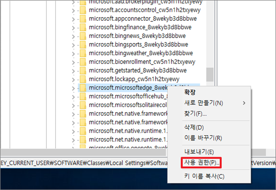 ▼ microsoft.microsoftedge_8wekyb3d8bbwe 를 선택한 후 오른 마우스를 눌러 [사용 권한] 메뉴를 선택합니다.
