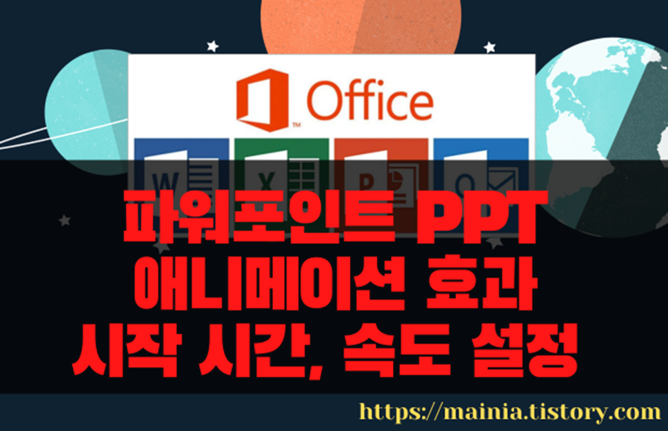 파워포인트에서 애니메이션 작업을 할 때 중요한 요소인 시작 방법과 시간, 속도를 조절하는 방법에 대해 알아 보겠습니다. 이것들을 잘 조절하면 아주 다양한 효과를 손쉽게 만들 수 있습니다. 타이밍 옵션은 3가지로 나눠 지는데 시작, 재생 시간, 지연이 있습니다. 각 옵션을 하나씩 샘플과 함께 설명하도록 하겠습니다.