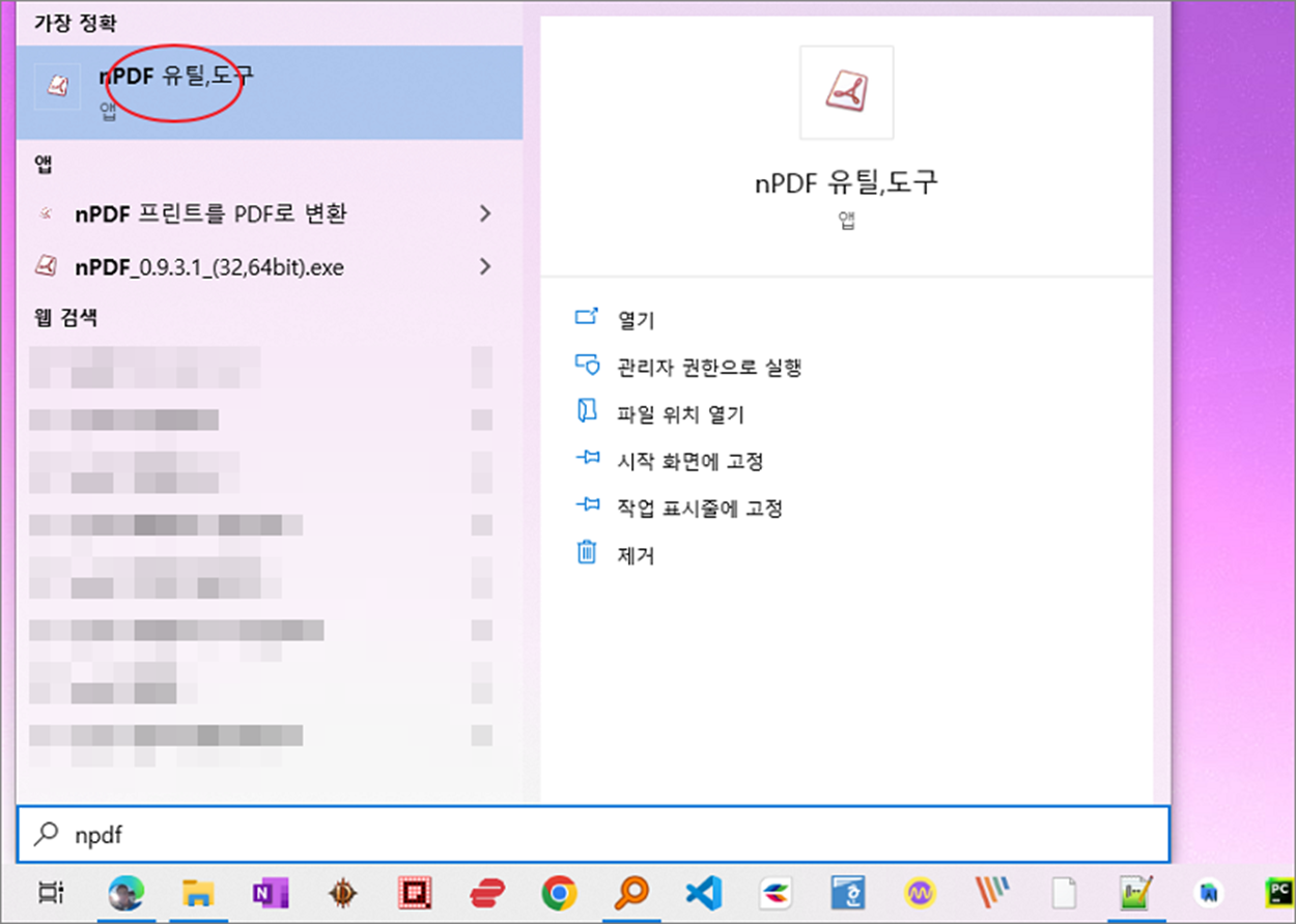 ▼ 파일을 설치하고 검색에서 nPDF 를 찾습니다. 검색 결과에서 nPDF 유틸, 도구 앱을 클릭해서 실행합니다.