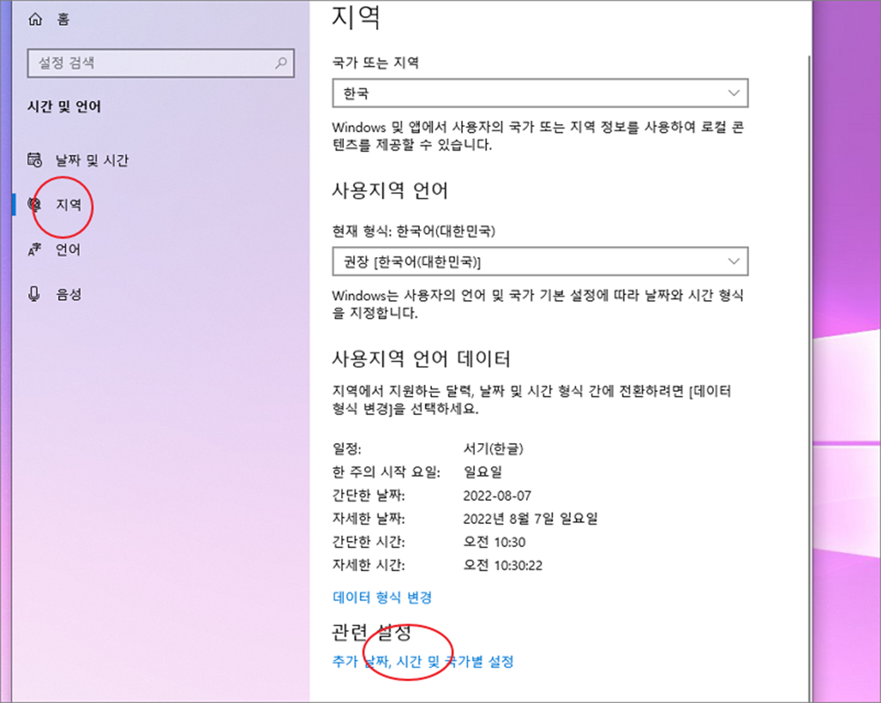 ▼ 윈도우10에서 제공하는 설정 옵션으로는 변경할 수 없기 때문에 제어판의 “국가 또는 지역” 옵션에 가야 합니다. 관련 설정란에서 [추가 날짜, 시간 및 지역 설정] 메뉴를 클릭합니다. 그럼 제어판을 거치지 않고 바로 갈 수 있습니다.