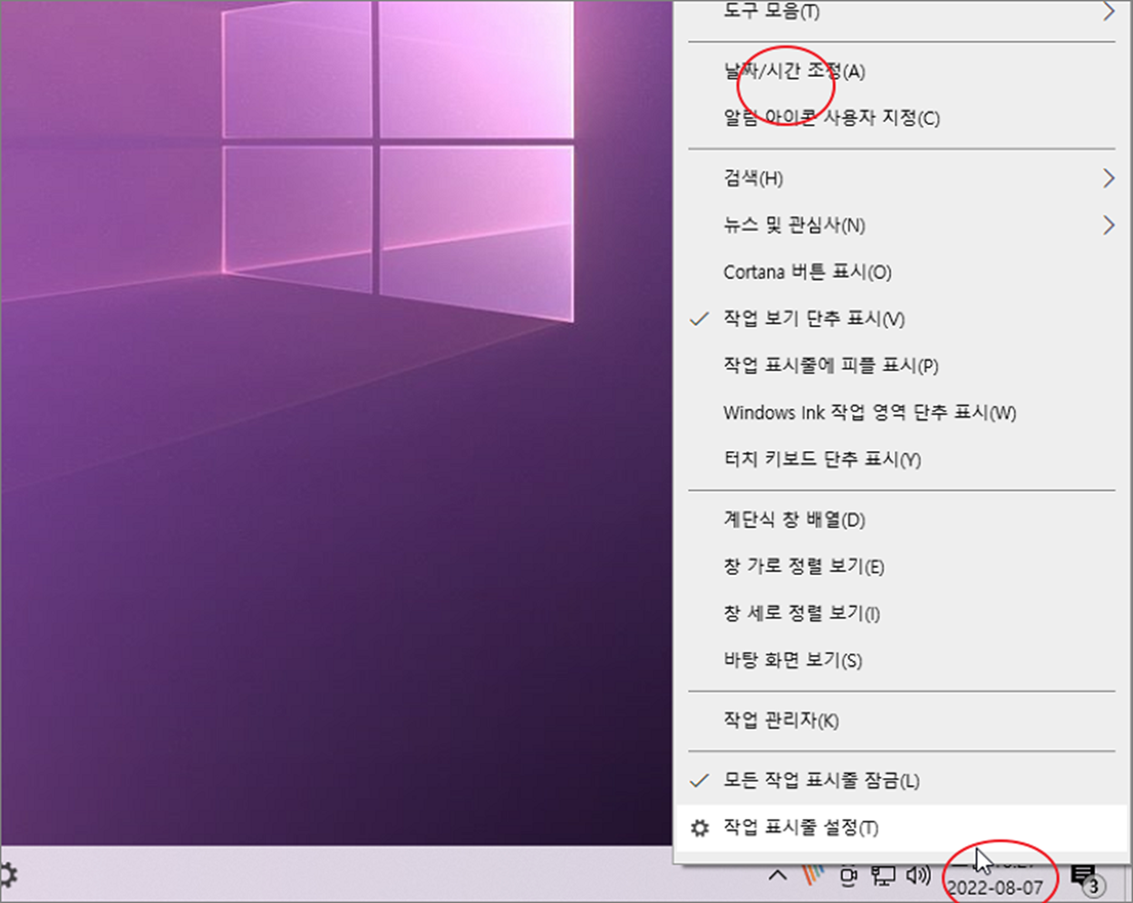 ▼ 먼저 윈도우10 에서 새로 구성된 날짜 및 시간 형식 변경 옵션으로 가 보겠습니다. 작업 표시줄의 시간 영역에 마우스를 가져간 후 오른 마우스를 눌러 [날짜/시간 조정] 메뉴를 선택합니다.