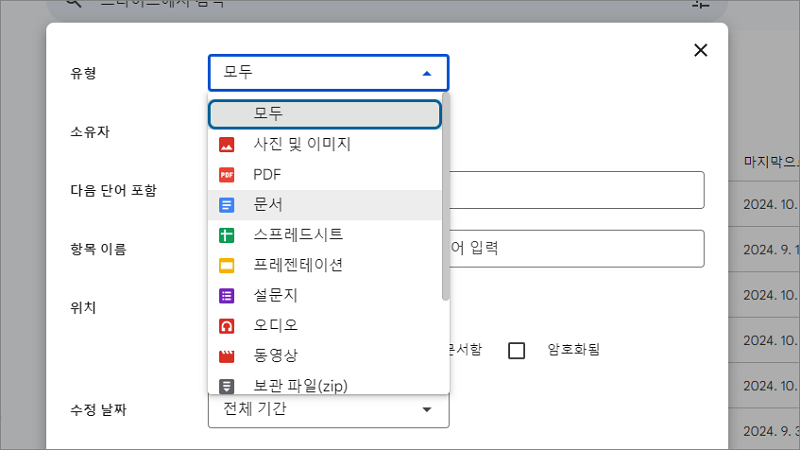 ▼ 구글 드라이브 페이지 상단 검색 란 에서 오른쪽 끝에 옵션 버튼을 클릭합니다.