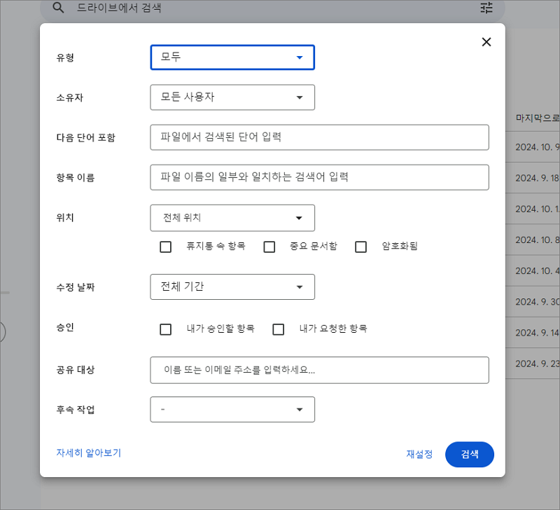 ▼ 화면에는 옵션 설정 창이 나타납니다. 다양한 옵션들이 있으니 그 중에서 원하는 것을 선택하고 검색하시면 됩니다.