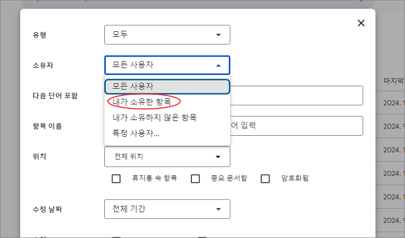 ▼ 주요 체크 옵션은 [다음 단어 포함]과 [소유자] 입니다. 윈도우 탐색기에서 파일을 검색할 때는 파일 내부에 있는 텍스트는 검색하지 않습니다. 하지만 구글 드라이브는 [다음 단어 포함] 에 입력된 단어를 문서 내부에서 뒤집니다. 아주 디테일 하게 찾을 수 있는 옵션입니다. 그리고 [소유자]에 옵션은 처음 파일을 누가 만들었느냐를 나타냅니다. 구글 문서도구에서 만들면 내가 소유한 항목이지만 PC 에서 작성한 문서는 아닙니다.