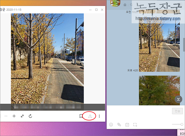 ▼ 먼저 카카오톡 PC 버전을 실행합니다. 다음 이미지나 동영상을 선택하면 미리보기 화면이 나타납니다. 미리보기 오른쪽 하단에 저장 버튼을 누르면 파일 저장을 위한 팝업창이 뜹니다. 보통 아무 생각없이 저장 확인 버튼을 눌러 저장합니다.