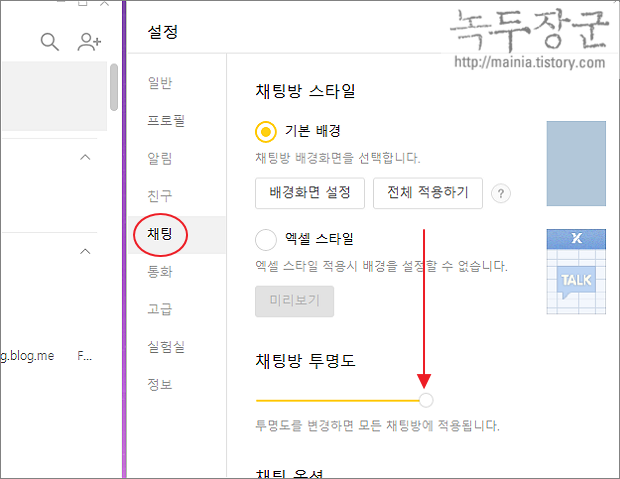 ▼ 설정 화면에서 왼쪽 사이드에 채팅 메뉴를 선택합니다. 채팅 옵션 화면에서 아래로 내려갑니다.