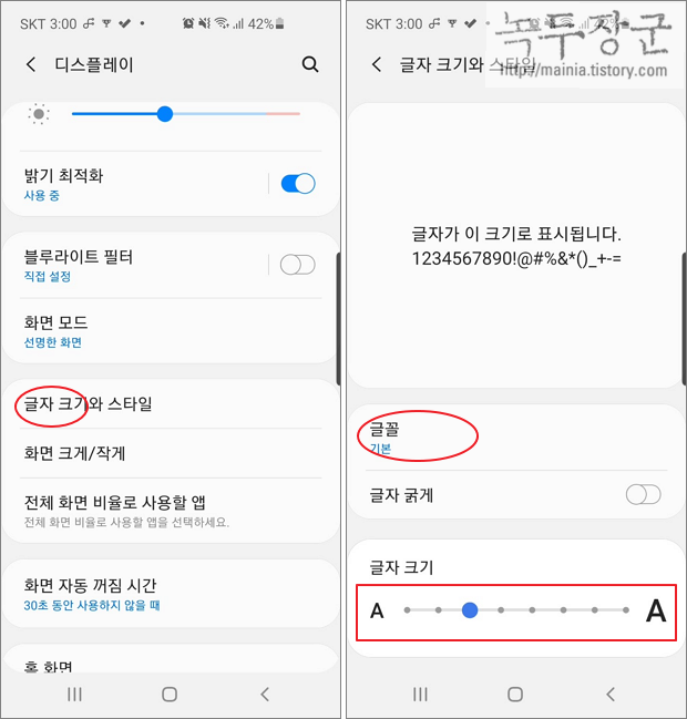 ▼ 디스플레이 메뉴 목록에서 글자 크기와 스타일을 선택합니다. 글자크기와 스타일에는 글꼴 변경과 크기를 조절 옵션을 제공합니다. 하단에 슬라이드 옵션을 조절해서 자신에게 크기를 찾습니다.