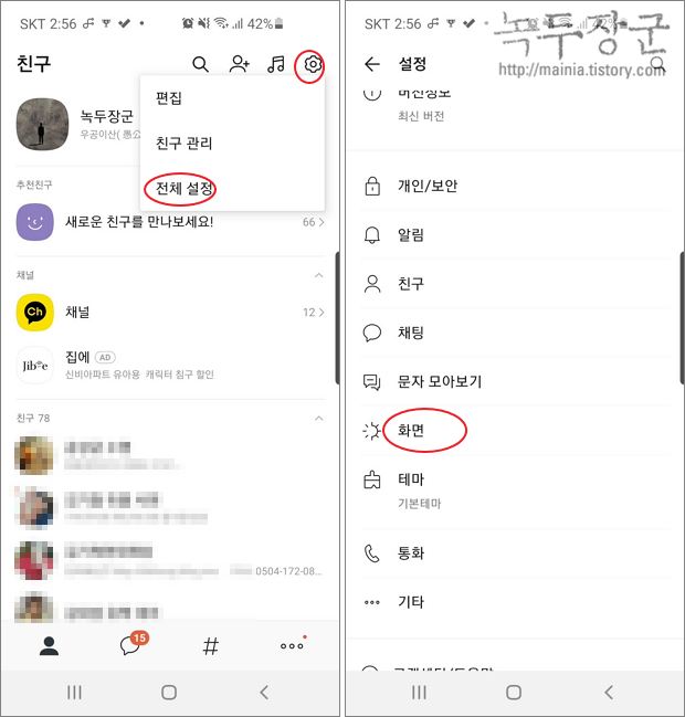 ▼ 카톡을 열어서 오른쪽 상단 설정 아이콘 > 전체 설정 메뉴를 선택합니다. 설정 목록에서 화면 메뉴를 찾아 상세 화면으로 이동합니다.