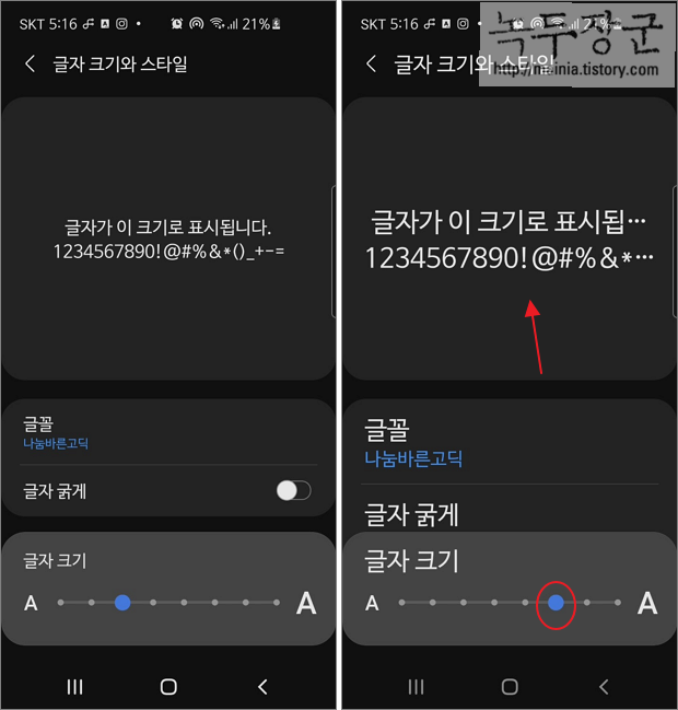 ▼ 갤럭시 설정에서 변경한 글자크기를 적용한 결과입니다.