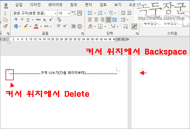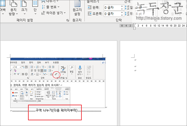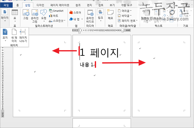 ▼ “새 페이지” 일 경우 완전히 새로운 페이지가 생성이 되고 커서 다음에 있는 내용은 다음 페이지로 넘어가서 또 다른 페이지를 만듭니다. 그러니까 두 개의 새로운 페이지가 만들어 지는 것이죠.