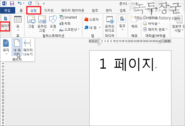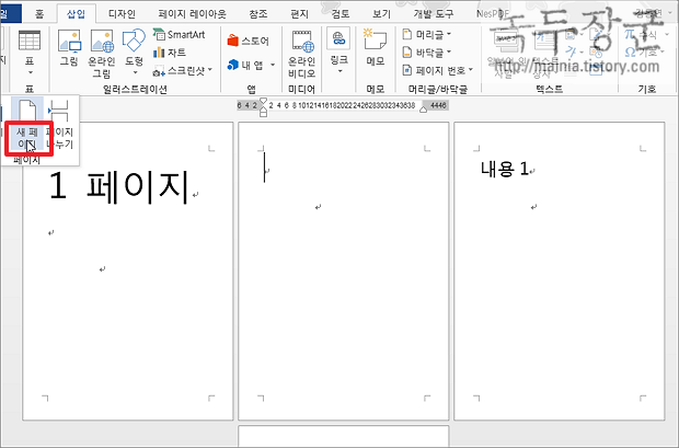 ▼ 새 페이지를 추가하기 위해서는 삽입 탭의 페이지 리본 메뉴로 가야 합니다. 페이지 리본 메뉴 하위에는 “새 페이지”와 “페이지 나누기”가 있습니다.